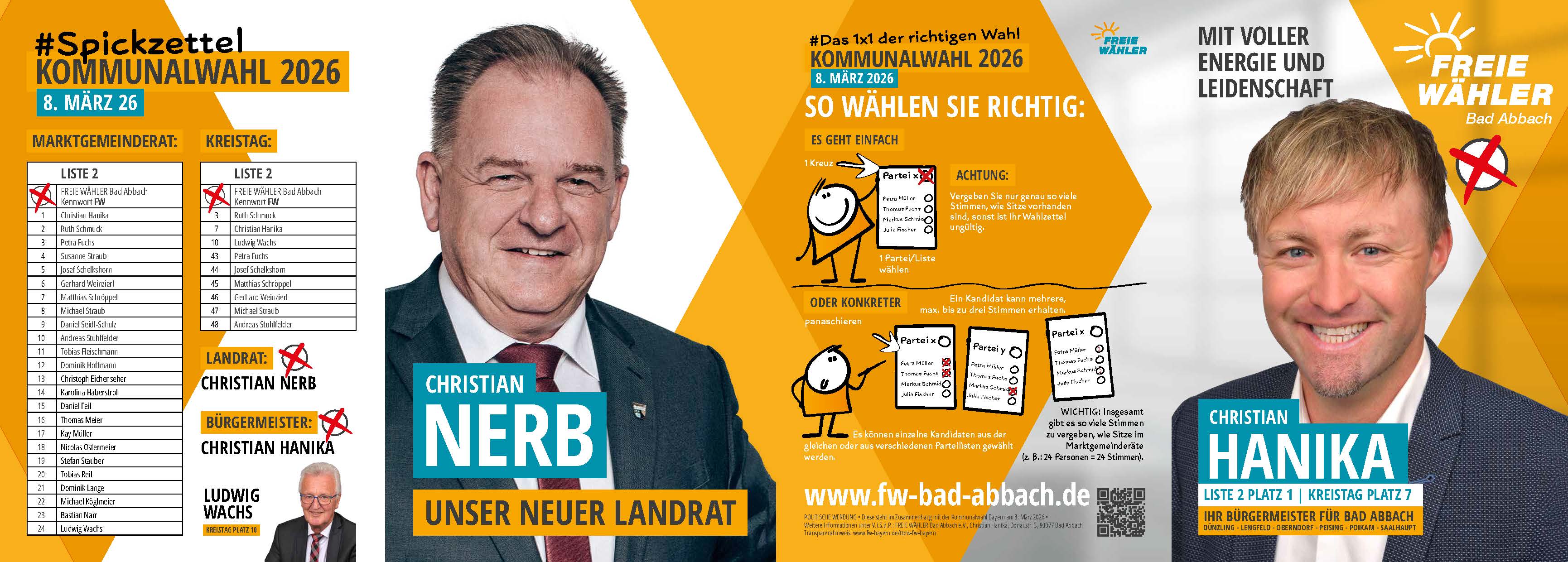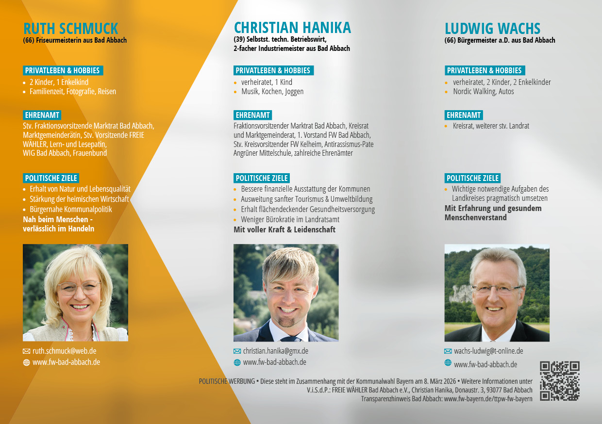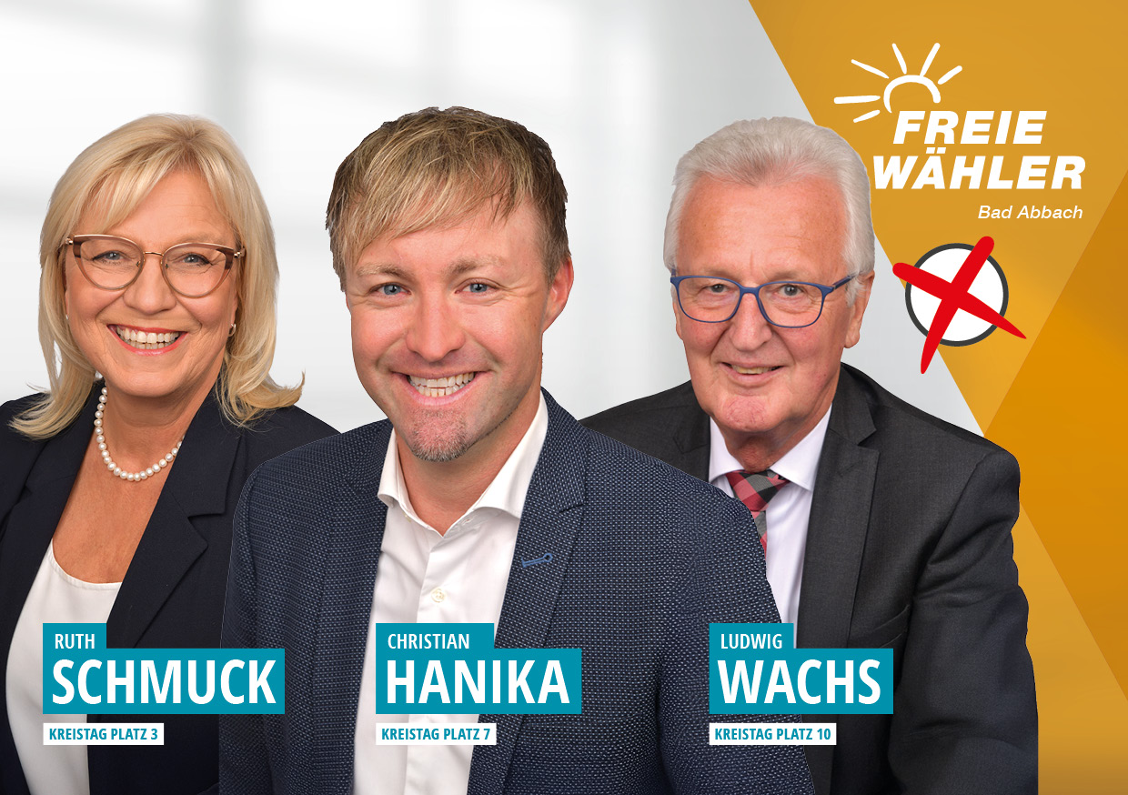 Hier finden Sie eine Übersicht der Kandidatinnen und Kandidaten der Freien Wähler Bad Abbach zur Kommunalwahl. Sie stehen für unabhängige Kommunalpolitik, bürgernahe Entscheidungen und eine nachhaltige Entwicklung unserer Gemeinde.